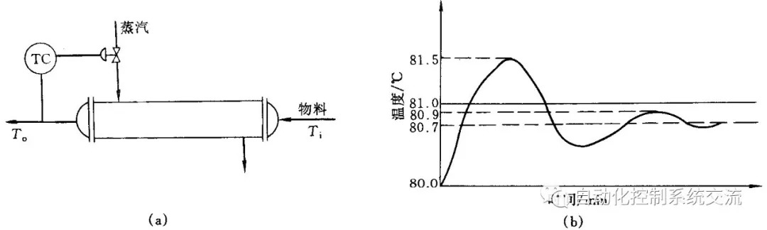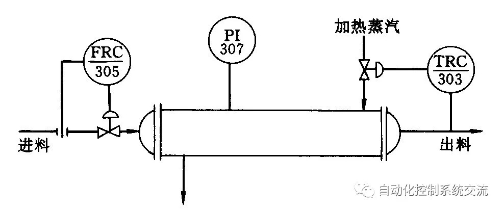 其中:被控对象是蒸汽加热器;被控变量是出口物料温度;操纵变量是蒸汽流量。