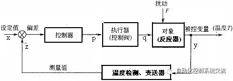 若当反应器内的被控温度在干扰作用下升高时,其测量值与给定值比较,获得偏差信号,经温度控制器运算处理后,输出控制信号去驱动控制阀,使其开度增大,冷却水流量增大,这样使反应器内的温度降下来。所以该温度控制系统是一个具有负反馈的闭环控制系统。