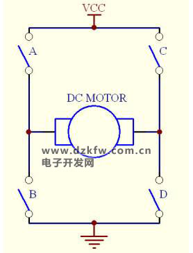 从图中可以看出,假设开关A、D接通,电机正向转动,而开关B、C接通时,直流电机将反向转动,从而实现了电机的正反控制。当然实际应用中我们还可以得到其它两种状态: