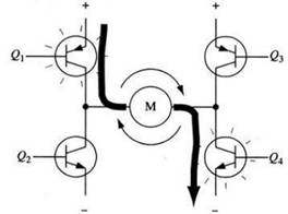 要使电机运转,必须使对角线上的一对三极管导通。例如,如图图8所示,当Q1管和Q4管导通时,电流就从电源正极经Q1从左至右穿过电机,然后再经Q4回到电源负极。按图中电流箭头所示,该流向的电流将驱动电机顺时针转动。当三极管Q1和Q4导通时,电流将从左至右流过电机,从而驱动电机按特定的方向转动。