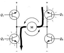 图9所示为另一对三极管Q2和Q3导通的情况,电流从右至左流过电机。当三极管Q2和Q3导通时,电流将从右至左流过电机,从而驱动电机沿另一方向转动。