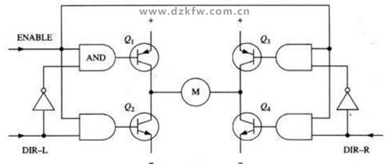 图10所示就是基于这种考虑的改进电路,它在基本的H桥电路的基础上增加了4个与门和2个非门。4个与门同一个使能导通信号相接,这样,用这一个信号就能控制整个电路的开关。而2个非门通过提供一种方向输入,可以保证任何时候在H桥的同侧都只有一个三极管导通。