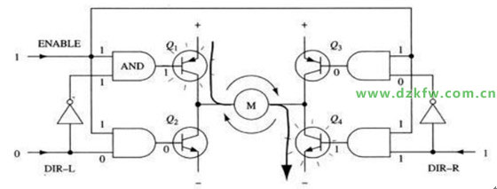 驱动电机时,保证H桥上两个同侧的三极管不会同时导通非常重要,如果三极管Q1和Q2同时导通,那么电流就会从正极穿过两个三极管直接回到负极,此时电路中除了三极管外没有其它任何负载,因此电路上的电流就可能达到最大值(该电流仅受电源性能限制),甚至烧坏三极管。基于上述原因,在实际驱动电路中通常要用硬件电路方便地控制三极管的开关。