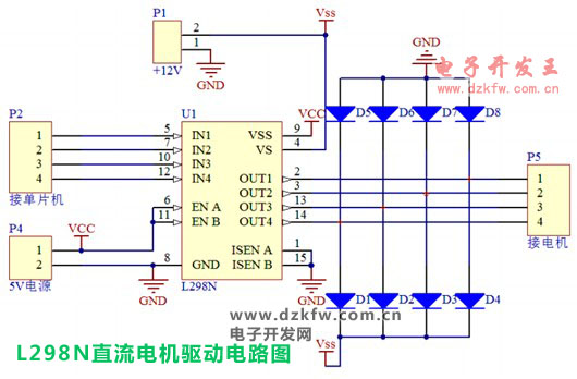1)电路图中有两个电流,一路为L298工作需要的5V电源VCC,一路为驱动电机用的电池电源VSS。