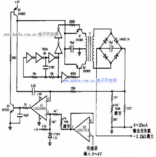 电流电路变送器电路图注:电路变送器的精度为12位。1%薄膜电阻,T1为PICO-31080。LT1013见说明。