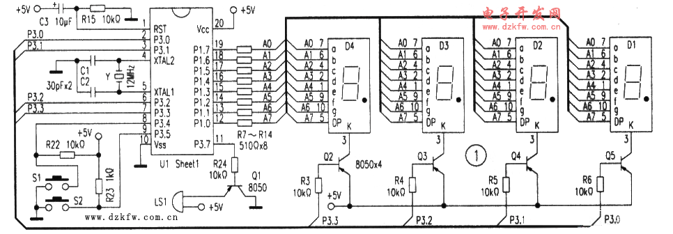 89C2051单片机端口设置:Pl口分别接数码管的段码口(a~h);P3.0、P3.1、P3.2、P3.3、分别接LED数码管的位驱动;P3.4接按键51,P3.5接按键52;P3,7驱动蜂鸣器。C3、R15构成上电复位电路。Q1~Q4为数码管显示驱动三极管。电路中没有画出电源部分,电路中的电源可以利用手机万用充电器作为本电路的供电部分。