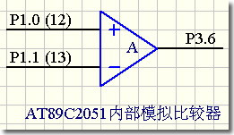 不知大家有没有发现: 标准51单片机有32根可编程I/O口线,89C2051精简掉P0、P2口16根I/O线后,应该还有16根I/O口线,现在只有15根,另一根跑那里去了呢?!前面讲到AT89C2051内部集成了一个模拟比较器,正是因为集成了模拟比较器把另一根引线占用了,比较器的输出端占用了一个I/O口,它就是P3.6口,引脚P3.6没有接出来的,所以少一根I/O口线。在编程时,P3.6就只能用来读比较器的状态了,不能象其它I/O口一样用来驱动外部指示灯等设备了,不过模拟比较器很实用的,在开发中就可以省去外加比较器的麻烦,右图为比较器的原理。 |
