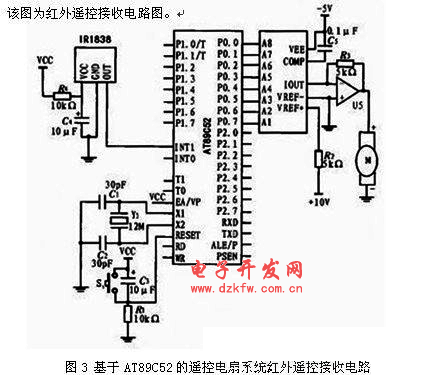 该图为红外遥控接收电路图。 如下图所示,单片机的左半部分是万能红外接收头 IR1838,其管脚1为输出,管脚2,3分别是接地和电源的输入,电源电压仍然为5 V,左半部分的单片机的最小系统完成的是单片机的复位功能和启停,右半部分电路是由一个 DAC0808芯片构成,该芯片输出与一个放大器相连,通过放大后将电压加在直流电机的两端,从而驱动了电机的工作。关于 DAC0808它的主要参数为,误差最大,快速建立时间为150 ns,高速输入乘以转换率为:8 mA/μs,电源电压为±4.5~±18 V 到,该芯片为低功耗的,最大功耗为33 mW。该 DAC 是8位的,也就意味着输入的范围为0到255,输出的电压从0~10 V 变化的,这样最小精度为10/255 V,但是经过一个集成放大器后,也就能驱动一个小小的电动机了。