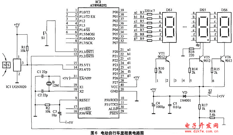 下图是电动自行车里程表原理图,该图能实现以下功能:显示总里程、本次里程和行驶速度(采用6为数码管显示)。