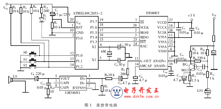 最后按“S2”键,从第N段到第1段逆序(也可顺序)放音,可以校验录音正确与否。语音信号的输入主要以三极管9013和驻极体传声器为核心的放大电路组成。录音时,用ANAIN+端录音的音质最佳,失真最小。输出端选用音频功率放大器lm386输出功率300mW左右(电源电压为+5V时)。由于ISD4003系列器件