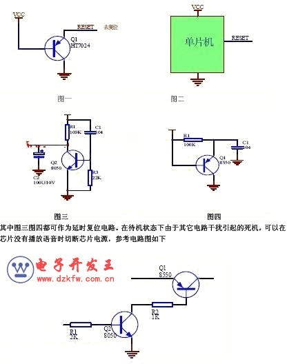 单片机复位电路,以下是推荐用的几种典型复位电路,其中图三图四都可作为延时复位电路。在待机状态下由于其它电路干扰引起的死机,可以在芯片没有播放语音时切断芯片电源,参考电路图如下: