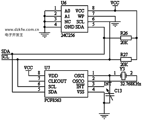 如图所示,由EEPROM24C256和日历时钟芯片PCF8563组成。