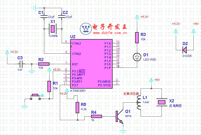 为了使门铃更有个性化,我采用的是单片机,用单片机来产生所需要的响声。其电路原理是控制单片机的IO口产生适当频率的方波,经过三极管放大后驱动自藕变压器的一次测,这时在变压器的二次测会产生相同频率的高压方波从而使压电陶瓷片发生形变,发出较大的门铃声。电源使用的是4节干电池,共6V,单片机电源是6V电源通过二极管降压0.7V后提供。