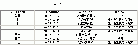 遥控器采用长虹彩电K11F型遥控器,遥控器按照16位地址码,8位数据码以及8位数据码的反码发送。表一列出了各按键的编码及本电子钟对应的动作。如果采用其他遥控器,需对程序相应部分的编码作修改。