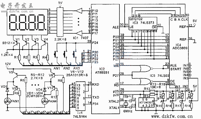 本装置的工作原理如下图所示,IC2为主控芯片AT89S51,IC4为8位逐次逼近式A/D转换芯片ADC0809,RT1~RT4分别是测量CPU、电源、机箱、显卡温度的热敏电阻,FAN1~FAN4分别是控制CPU、电源、机箱、显卡温度的风扇。以CPU温度控制为例,当温度升高时RT1阻值变小,A点电压升高,该变化的电压作为待转换的模拟量进入ADC0809的输入通道IN0,经AD转换、查表后换算成温度值在数码管上显示出来,其中最左边一位显示“1”(1代表CPU,2代表电源,3代表机箱,4代表显卡),左边第二位不显示,最后两位显示CPU当前的实际温度值。显示范围为0~70℃,当温度低于设定的温度下限时,单片机通过串行口发出控制指令经74LS164.移位输出,使V5、V9截止,风扇FAN1停止转动。