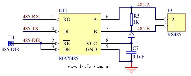 MAX485是美信(Maxim)推出的一款常用RS485转换器。其中5脚和8脚是电源引脚,6脚和7脚就是485通信中的A和B两个引脚,而1脚和4脚分别接到我们单片机的RXD和TXD引脚上,直接使用单片机UART进行数据接收和发送。而2脚和3脚就是方向引脚了,其中2脚是低电平使能接收器,3脚是高电平使能输出驱动器。我们把这两个引脚连到一起,平时不发送数据的时候,保持这两个引脚是低电平,让MAX485处于接收状态,当需要发送数据的时候,把这个引脚拉高,发送数据,发送完毕后再拉低这个引脚就可以了。为了提高RS485的抗干扰性能,需要在靠近MAX485的A和B引脚之间并接一个电阻,这个电阻阻值从100欧到1K都可以。
