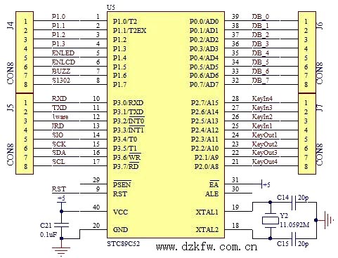 在这里我们还要介绍一下如何使用KST-51单片机开发板进行外围扩展实验。我们的开发板只能把基本的功能给同学们做出来提供实验练习,但是同学们学习的脚步不应该停留在这个实验板上。如果想进行更多的实验,就可以通过单片机开发板的扩展接口进行扩展实验。大家可以看到蓝绿色的单片机座周围有32个插针,这32个插针就是把单片机的32个IO引脚全部都引出来了。在原理图上体现出来的就是我们的J4、J5、J6、J7这4个器件,如图2所示。