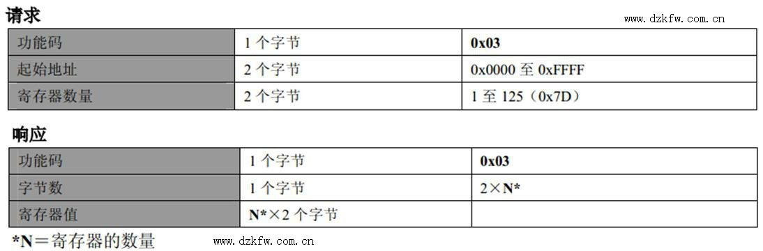 数据:跟在功能代码后边的是n个8bit的数据。这个n值的到底是多少,是功能代码来确定的,不同的功能代码后边跟的数据数量不同。举个例子,如果功能码是0x03,也就是读保持寄存器,那么主机发送数据n的组成部分就是:2个字节的寄存器起始地址,加2个字节的寄存器数量N*。从机数据n的组成部分是:1个字节的字节数,因为我们回复的寄存器的值是2个字节,所以这个字节数也就是2N*个,再加上2N*个寄存器的值,如图6所示。