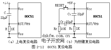 这种复位电路的工作原理是:通电时,电容两端相当于是短路,于是RST管脚上为高电平,然后电源通过电阻对电容充电,RST端电压慢慢下降,降到一定程序,即为低电平,单片机开始正常工作。
