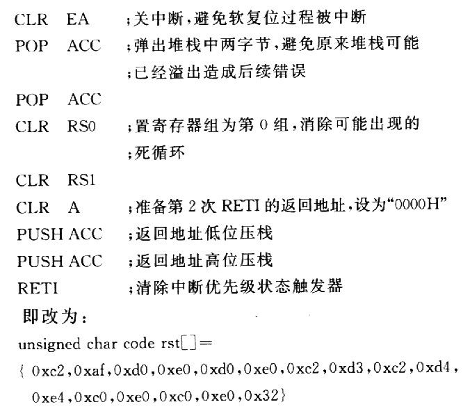 本程序使用一个C51函数完成了完整的包含两次RETI在内的复位操作,消除了所有已知隐患,只需在应用程序中包含此reset_best()函数,在需要软复位时调用即可。2.1节中所列汇编语言的子程序也可使用本节分析时所用汇编代码代替。