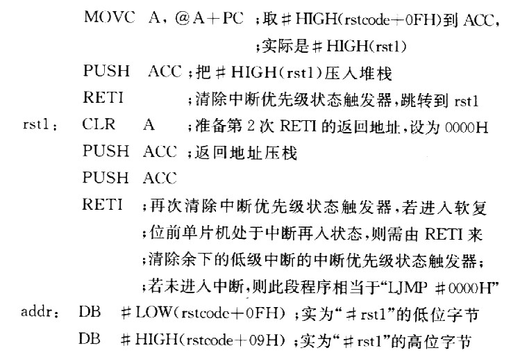 当本程序被调用并执行到“MOVC A,@A+PC”时,分两次取到的分别是“#rstl”的低位和高位字节,把它们压栈以后再调用RETI指令,除了清除可能有的中断优先级状态记录外,还会跳转到rstl执行后续的连续两次压栈操作,把第2次RETI的返回地址设为0000H,再通过紧接着的RETI指令,清除可能还有的中断优先级状态记录,并跳转到0000H完成完整的复位操作。