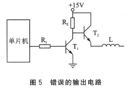 T1截止、T2导通期间,为了对T2提供足够的基极电流,R2的阻值必须很小。因为T2处于射极跟随器方式工作,因此为了减少T2损耗,必须将集射间电压降控制在较小范围内。这样集基间电压也很小,电阻R2阻值很小才能提供足够的基极电流。R2阻值过大,会大幅度增加T2压降,引起T2发热严重。而在L2截止期间,T1必须导通,高压+15 V全部降在电阻R2上,产生很大的电流,显然是不合理的。另外,T1的导通将使单片机高电平输出被拉低至接近地电位,引起输出端不稳定。T2基极被T1拉到地电位,若其后接的是感性负载,由于绕组反电势的作用,T2的发射极可能存在高电平,容易引起T2管基射结反向击穿。