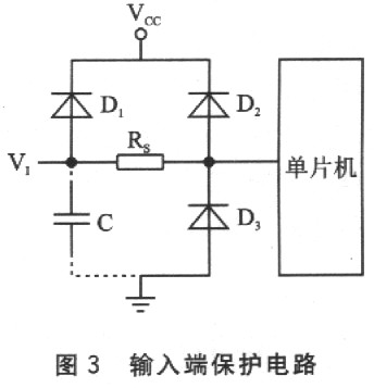 在满足功能的前提下,提高单片机输入端可靠性最简单的方案是:在输入端与地之间并联一只电容来吸收干扰脉冲,或串联一只金属薄膜电阻来限制流入端口的峰值电流。