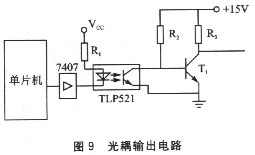 光电耦合可以传输线性信号,也可以传输开关信号,在输出级应用时主要用来传递开关信号。如图9所示,单片机输出控制信号经缓冲器7407放大后送入光耦。R2为光耦输出晶体管的负载电阻,它的选取应保证:在光耦导通时,其输出晶体管可靠饱和;而在光耦截止时,Tl可靠饱和。但由于光耦响应速度慢使开关延迟时间加长,限制了其使用频率。