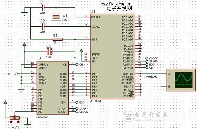 说明:使用数模转换芯片 ADC0808,通过调节可变电阻 RV1 来调节脉冲宽度,