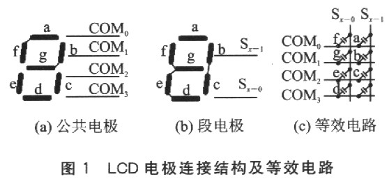 图1为血压计LCD的电极连接结构及等效电路。其中,图l(a)为公共电极连接排列,图l(b)为段电极连接排列。它共有4个公共电极COM0~COM3,每位数码各有2个段电极Sx-0、Sx-1,其等效电路为一个4行×2列的矩阵,如图l(c)所示。