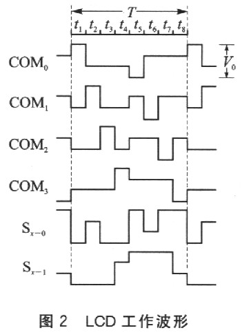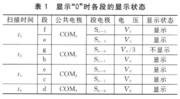 由图2可知,不考虑信号的直流分量,所有波形的前半周期t1~t4与后半周期t5~t8大小相等,极性相反。COM0~COM3信号电压依次在t1~t4四个时间内达到峰值。时间t1为第1行上f、a两段的扫描时间,公共电极COM0,Sx-0为f段的段电极,Sx-1为a段的段电极。在t1时间内,f段上的电压COM0-Sx-0=V0,a段上的电压COM0-Sx-1=V0,f、a两段均处于选择状态,显示。其余各段在其扫描时间内的电压和显示状态如表1所列。7段中只有g段上的电压为V0/3,处于非选择状态,不显示。其余6段均处于选择状态,显示。因此,显示数字“O”。