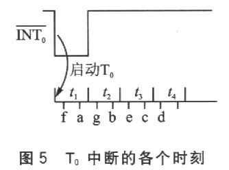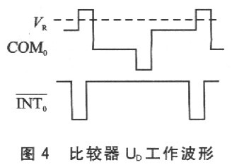 UC和UD组成INT0中断信号产生电路。UC接成电压跟随器,减小电路对COM0信号的影响。R2、C2组成RC滤波器,滤除高频干扰。UD作电压比较器,参考电压VR加在同相输入端,VR大小由电位器W2调节于2V0/3~V0。电压比较器将COM0信号转换为INT0负脉冲信号,工作波形如图4所示。负脉冲的下降沿为LCD驱动信号周期T的起始时刻。此负脉冲接至8051的INT0脚,在负脉冲的下降沿产生外部中断0。