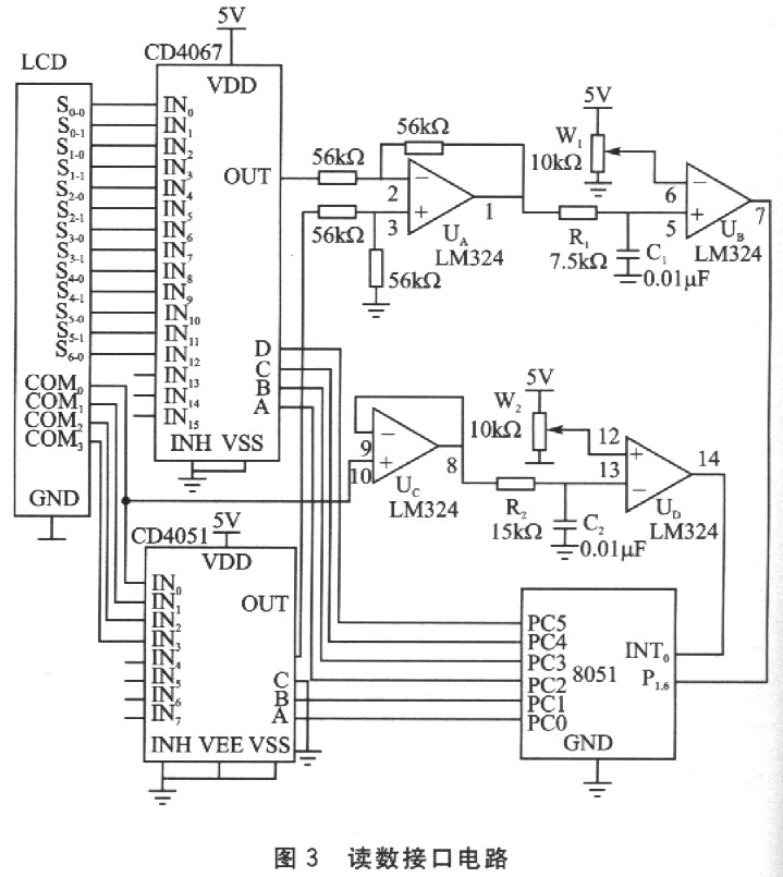 由CD4067、CD3405l、LM324(UA、UB)组成显示状态读取电路,读取LCD数码各段的显示状态。CD41367多路模拟开关从LCD的13个段电极信号中选择一路Sx-x输出到LM324(UA)的反相输入端2脚。CD405l多路模拟开关从LCD的4个COM信号中选择一路COMx输出到LM321(UA)的同相输入端3脚。LM324(UA)接成模拟减法器,由1脚输出信号COMx-Sx-x。UB作电压比较器,参考电压VR大小由电位器W1调节于V0/3~V0之间,将段电压COMx-Sx-x与VR比较。比较结果为该段的显示状态,高电平说明该段显示,低电平不显示。显示状态送入8051的P1.6脚。R1、C1组成RC滤波器,滤除高频干扰。