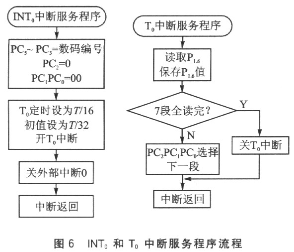 通过外部中断O和定时器T0以中断方式读取LCD某一编号数码的字形码。如图5所示,INT0负脉冲在周期T的起始时刻引起外部中断O,由INT0中断服务程序启动T0定时器,依次在t1~t4半个周期内的f、a、g、b、e、c、d各时刻产生T0中断,读取各段的显示状态,获得字形码。T0定时器设为工作方式2,自动再装入定时时间为T/16,初始定时时间为T/32。INT0和T0中断服务程序流程如图6所示。