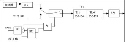 GATE=1,在此种情况下,计数脉冲通路上的开关不仅要由TR1来控制,而且还要受到INT1管脚的控制,只有TR1为1,且INT1管脚也是高电平,开关才合上,计数脉冲才得以通过。这个特性能用来测量一个信号的高电平的宽度,想想看,怎么测?