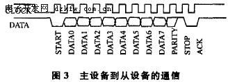 当从设备向主设备发送数据时,首先检查时钟线,以确认时钟线是否为高电平.如果是高电平,从设备就可以开始传输数据;反之,从设备要等待获得总线的控制权,才能开始传输数据.传输的每一帧由11位组成,发送时序及每一位的含义如图2所示.
