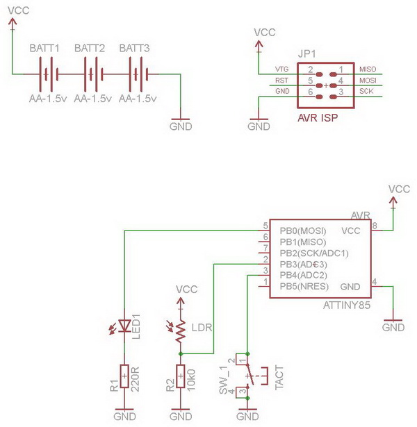 ATtiny 电子蜡烛最难的部分就闪烁神态逼真,所以皮特做了一个蜡烛光检测电阻( LDR )和固定电阻作为一个分压器。这是作为ATTINY85 ADC之中的一个输入端,并离散时间间隔的进行采样。采样速率为100毫秒。然后将采集的8bit的电频值存储到EEPROM中,以便记录蜡烛的闪烁图谱,驱动将其连接的LED、PWM形成通路。在用三节干电池供电。最后您只需编程程序,然后通过开关进行控制。