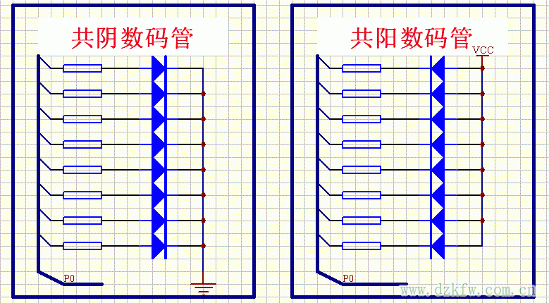 从我们板子的电路图上能看出来,我们所用的数码管是共阳数码管,如图所示。