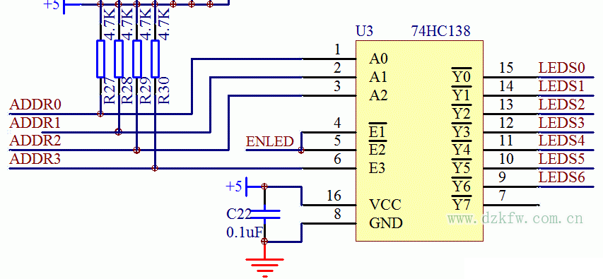 我们现在的目的是让LEDS0这个引脚输出低电平,相信大家现在可以独立根据前边学到的内容把ADDR0,ADDR1,ADDR2,ADDR3,ENLED这4个输入状态写出来,现在大家不要偷懒,都去根据138的手册去写一下,不需要你记住这些结论,但是遇到就写一次,锻炼过几次后,遇到同类芯片自己就知道如何去解决问题了。