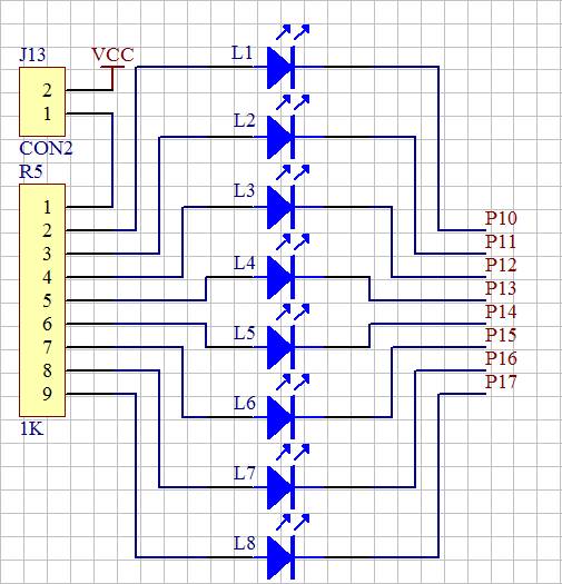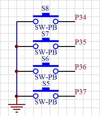 下面我写一个简单的程序,功能为:当一个键按下时,让一个发光二极管发光,我们先看下按键模块在实验板上的原理图,如图7和图8所示。