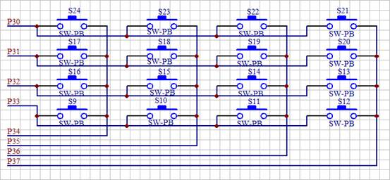 非编码键盘通常又分为独立键盘和矩阵键盘两大类。所谓独立键盘是指按键在与单片机相连时,每一个按键都与一个单片机单片机的I/O口相连,如图3所示;而对于一些应用系统中若需要较多按键时,采用独立键盘的连接方法,则比较耗费单片机的I/O口,此时我们一般会用到矩阵键盘,如图4所示,16个按键排成4行4列,称为4X4矩阵键盘,如按独立按键法,需要16个I/O口,而按图4的接法只需要8个I/O.