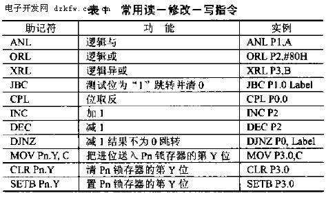 这些指令的一个共同特点, 就是要先并行读入Pn锁存器(非Pn端口引脚)中的值,作一定的修改,然后再写入谚端口的锁存器。表1中晶后三条指令读-修改-写关系不够明显。实际上它们的执行过程序是:先将Pn的8位锁存器内容一起读人,再对指定位进行修改, 然后又 8位一起写入锁存器。