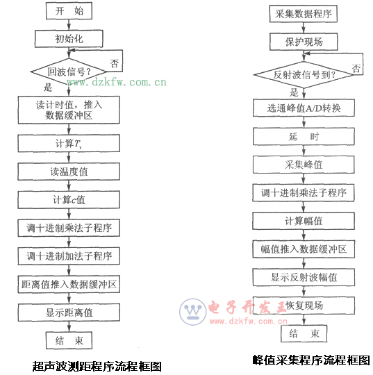 通过以上的设计措施和修正,使本系统具有较高的测距精度。经测定,本系统的测距在50~850 mm范围内,其测量误差在0.2 mm以内。测距程序和峰值采集程序流程框图如下图所示。