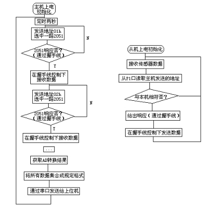 系统中51单片机作为主机控制着整个系统的动作并发起每次通信,每块2051作为实时从传感器获取数据并在主机控制下完成通信。主机和各从机之间通过并口连接通信。主从机工作流程如下: