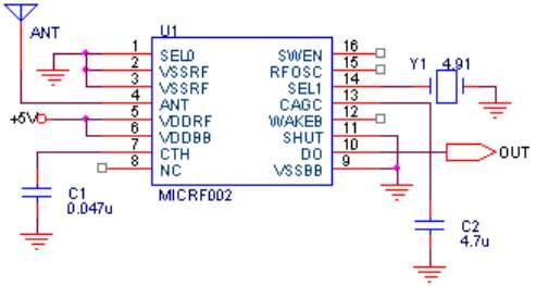 发射电路采用图1电路,接收电路采用图2电路,通信距离不小于200M。ICRF002美国Micrel公司推出的单片集成电路,可完成接收及解调。MICRF002是MICRF001的改进型,与 MICRF001相比,功耗更低,并具有电源关断控制端,可方便的与单片机接口。MICRF002性能稳定,使用非常简单。,ICRF002使用陶瓷谐振器,换用不同的谐振器,接收频率可覆盖300-440MHz。MICRF002具有两种工作模式:扫描模式和固定模式。扫描模式接受带宽可达几百KHz。此模式主要用来和LC振荡的发射机配套使用,因为,LC发射机的频率漂移较大,扫描模式下的数据通讯速率约为每秒2.5KBS。固定模式的带宽仅几十 KHz,此模式用于和使用晶振稳频的发射机配套,数据速率可达每秒钟10KBytes。工作模式选择通过MICRF002的第16脚(SWEN)实现。另外,使用唤醒功能可以唤醒译码器或CPU,以最大限度地降低功耗。