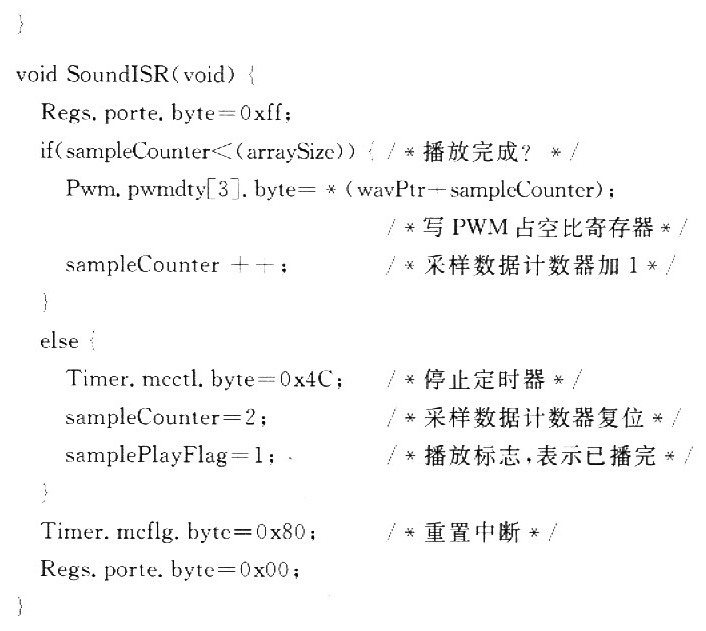 产生PWM波形的步骤:①设置定时器.产生定时中断:如采样率为ll.025 kHz.则设置定时器的定时中断频率为11.025 kHz。②初始化PWM模块,产生11.025kHz的PWM波形。③等待定时器中断,在中断处理程序中取采样数据,并设置PWM占空比寄存器,判断声音是否播放完成。若完成,则关定时器巾断,并停止PWM输出。