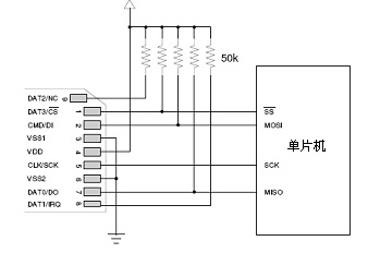 SD卡的SPI通信接口使其可以通过SPI通道进行数据读写。从应用的角度来看,采用SPI接口的好处在于,很多单片机内部自带SPI控制器,不光给开发上带来方便,同时也见降低了开发成本。然而,它也有不好的地方,如失去了SD卡的性能优势,要解决这一问题,就要用SD方式,因为它提供更大的总线数据带宽。SPI接口的选用是在上电初始时向其写入第一个命令时进行的。以下介绍SD卡的驱动方法,只实现简单的扇区读写。