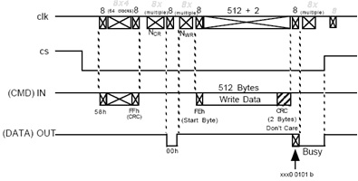 扇区写是SD卡驱动的另一目的。每次扇区写操作将向SD卡的某个扇区中写入512个字节。过程与扇区读相似,只是数据的方向相反与写入命令不同而已。