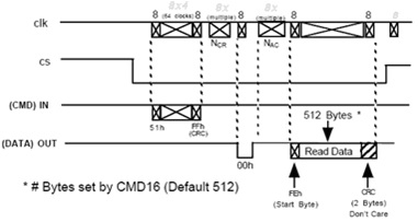 扇区读是对SD卡驱动的目的之一。SD卡的每一个扇区中有512个字节,一次扇区读操作将把某一个扇区内的512个字节全部读出。过程很简单,先写入命令,在得到相应的回应后,开始数据读取。