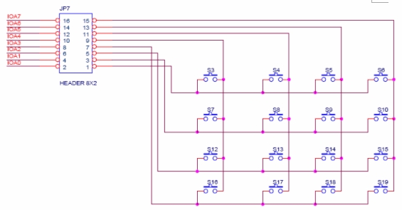 在设计中,使用了标准的4x4键盘,其电路图如图3-5所示。单片机的A口低8位为键盘的接口。尽管设计要求中只需要4个键对步进电机的状态进行控制,但考虑到对控制功能的扩展,我们使用了4x4的键盘。